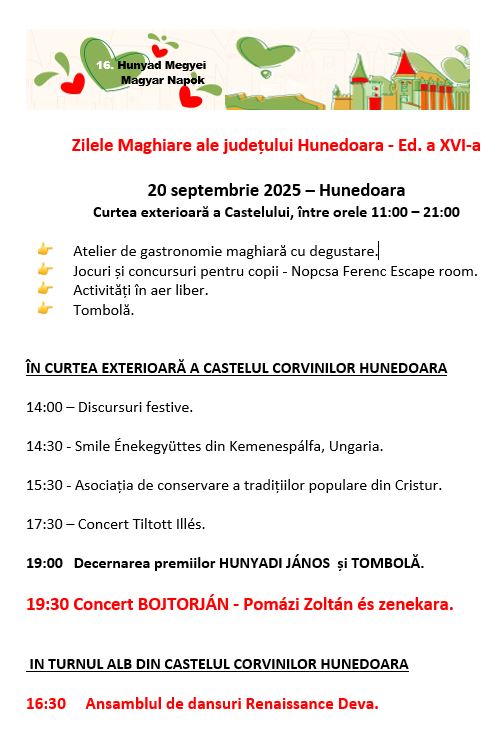 Castelul Corvinilor devine, din nou, gazda uneia dintre cele mai îndrăgite manifestări culturale din județ – Zilele Culturii Maghiare, ajunse la ediția cu numărul XVI.