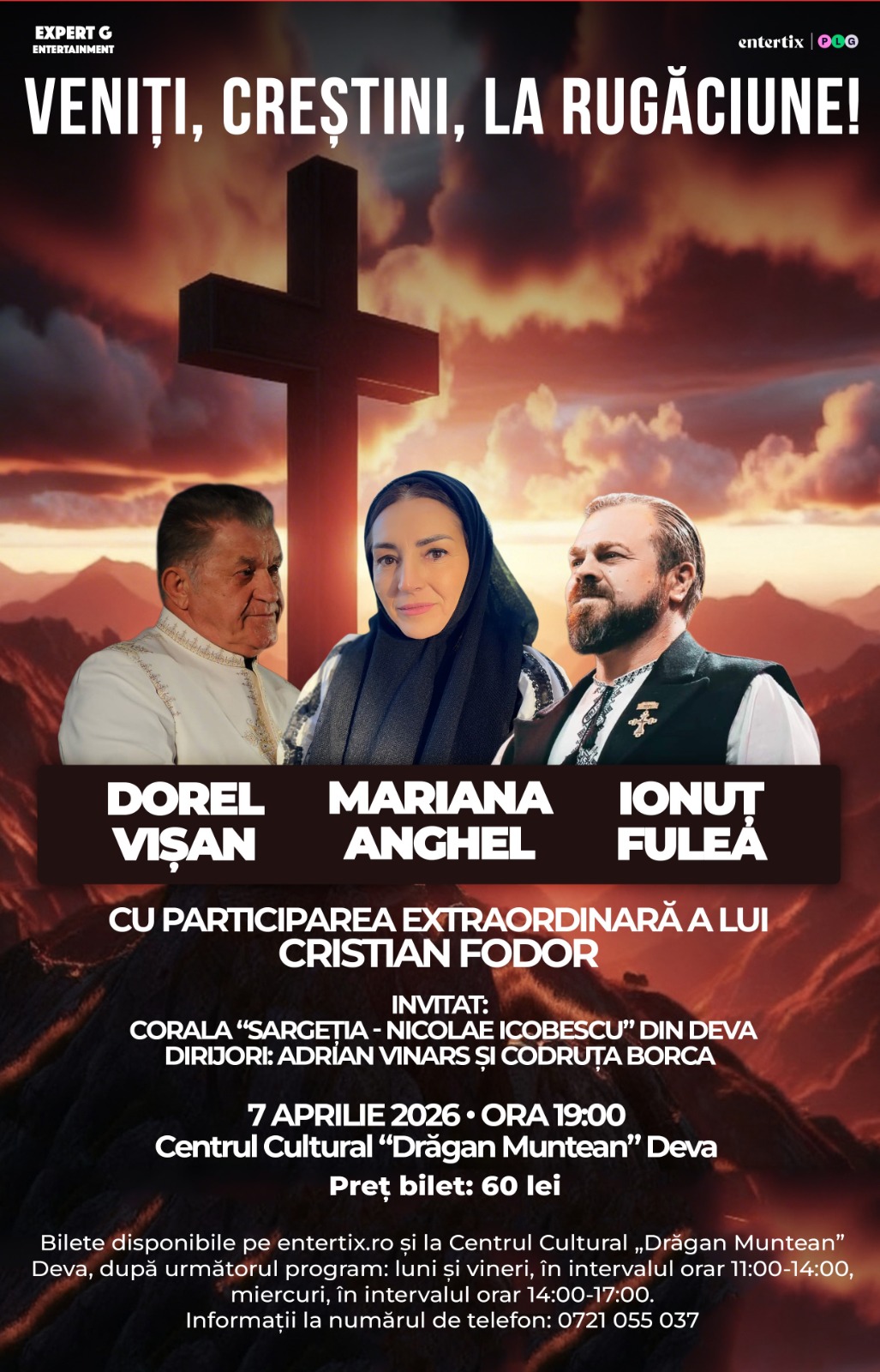 Primฤƒria Municipiului Deva ศ™i Centrul Cultural โ€žDrฤƒgan Munteanโ€ invitฤƒ publicul marศ›i, 7 aprilie, de la ora 19:00, la un eveniment de suflet dedicat perioadei premergฤƒtoare Sfintelor Sฤƒrbฤƒtori Pascale โ€“ spectacolul โ€žVeniศ›i, creศ™tini, la rugฤƒciune!โ€.