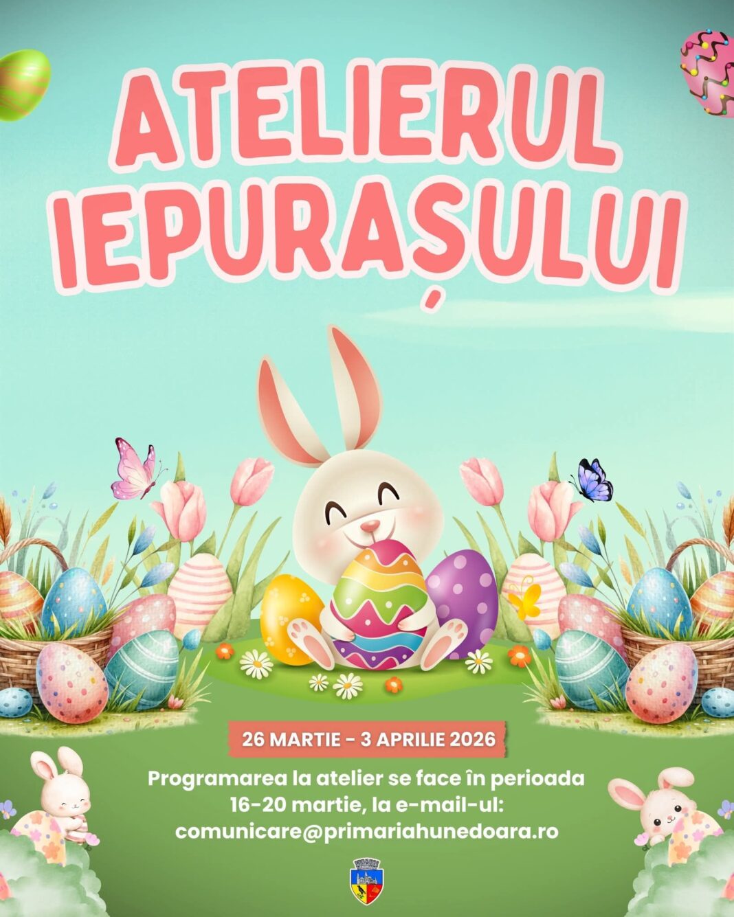 Timp de aproape două săptămâni, în Primăria Municipiului Hunedoara organizează „Atelierul Iepurașului – Ediția 2026” – Atelier de creaţie pentru copii. În perioada 26.03.2026 – 03.04.2026, grupuri de copii cu vârste cuprinse între 5 și 10 ani vor participa la acest atelier de creație. Cei mici vor putea să fie creativi și să își demonstreze talentul de a picta și crea diferite ornamente de Paște.