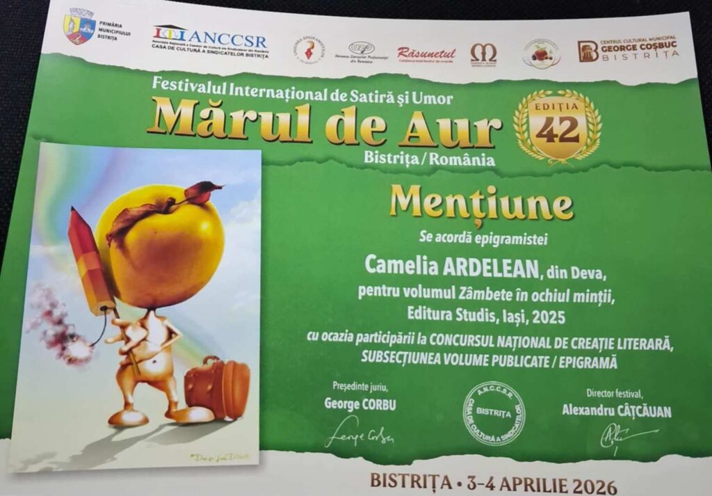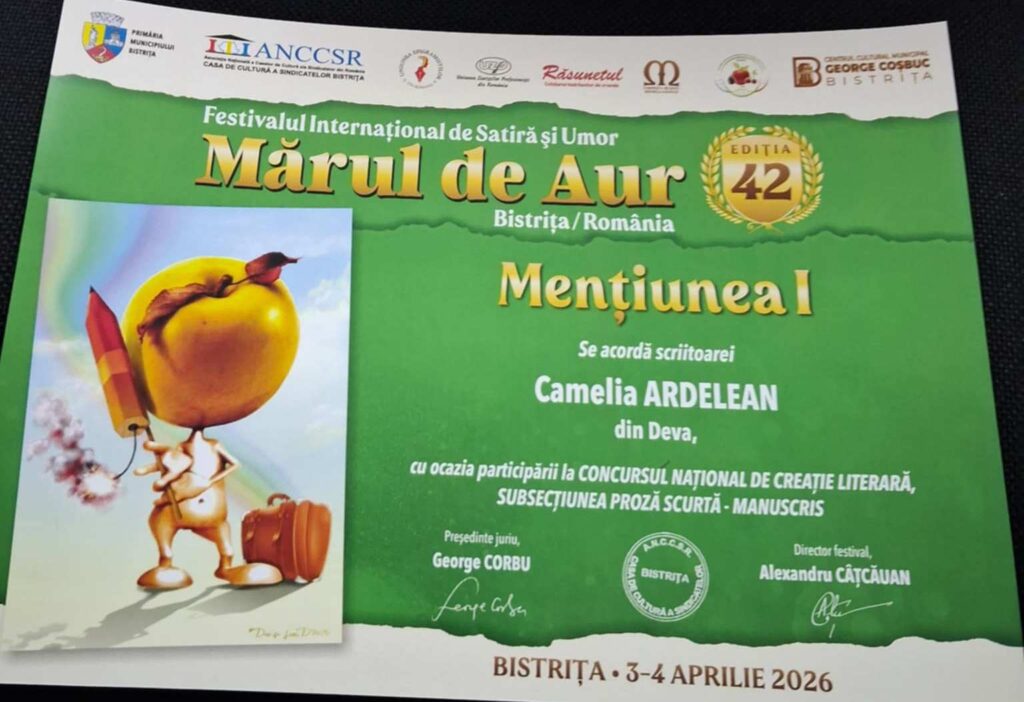 O bucurie dublă: două menţiuni la Festivalul Internaţional de Satiră şi Umor „Mărul de Aur” 2026 de la Bistriţa, pentru proză scurtă şi pentru un volum publicat. Deosebit de onorată şi încântată. Mulţumiri, iar şi iar, organizatorilor şi juriului care a apreciat creaţiile mele!”