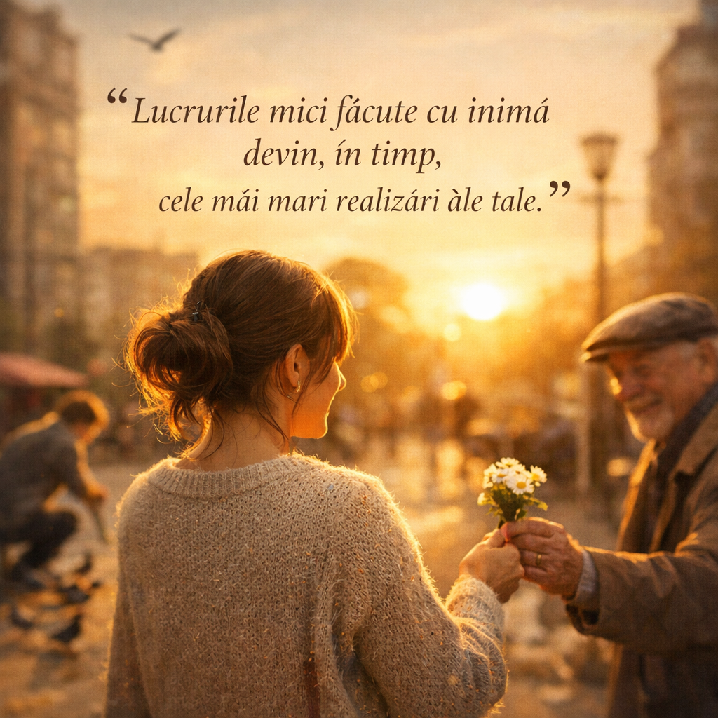 Într-un oraș agitat, trăia o femeie care își dorea să facă ceva important, ceva care să conteze cu adevărat. Dar zilele treceau, iar ea simțea că nu face nimic remarcabil.Într-o dimineață, a început cu un gest simplu: a ajutat un vecin, a zâmbit unui străin, a oferit o vorbă bună cuiva care avea nevoie. Nimic spectaculos, doar lucruri mici.Zi după zi, a continuat.Ani mai târziu, privind în urmă, și-a dat seama că viața ei fusese plină de sens. Nu printr-un moment grandios, ci prin sute de gesturi mici care au schimbat lumea din jurul ei.Atunci a înțeles: măreția nu vine dintr-un singur pas uriaș, ci din pași mici făcuți cu suflet.