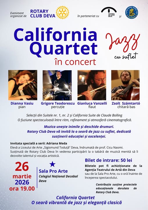 Pe 26 martie în sala Pro Arte a Colegiului Național Decebal din Deva, va avea loc un eveniment caritabil organizat de Rotary Club Deva în parteneriat cu Colegiul Național Decebal și Teatru de Artă din Deva. Va fi o seară de jazz cu suflet iar cei invitați să unească inimi și să deschidă drumuri, sunt cei de la California Quartet.