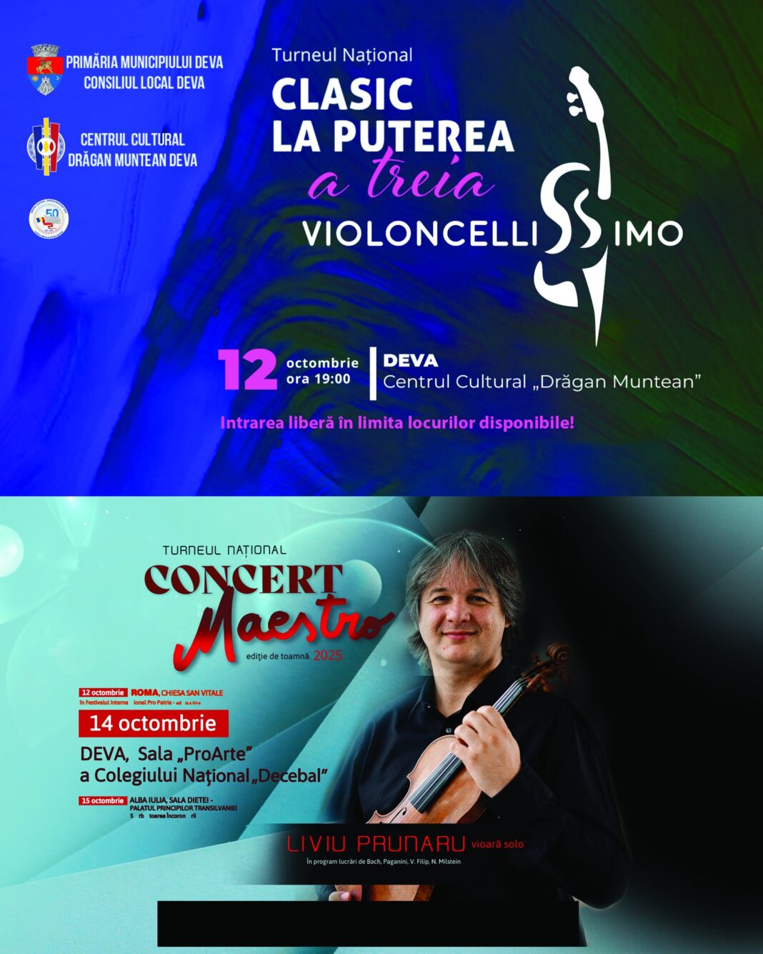 Primăria Municipiului Deva și Centrul Cultural „Drăgan Muntean” Deva îi invită pe iubitorii muzicii clasice să participe la două evenimente de excepție, care vor aduce pe scenele orașului sonorități rafinate și artiști de prestigiu.
