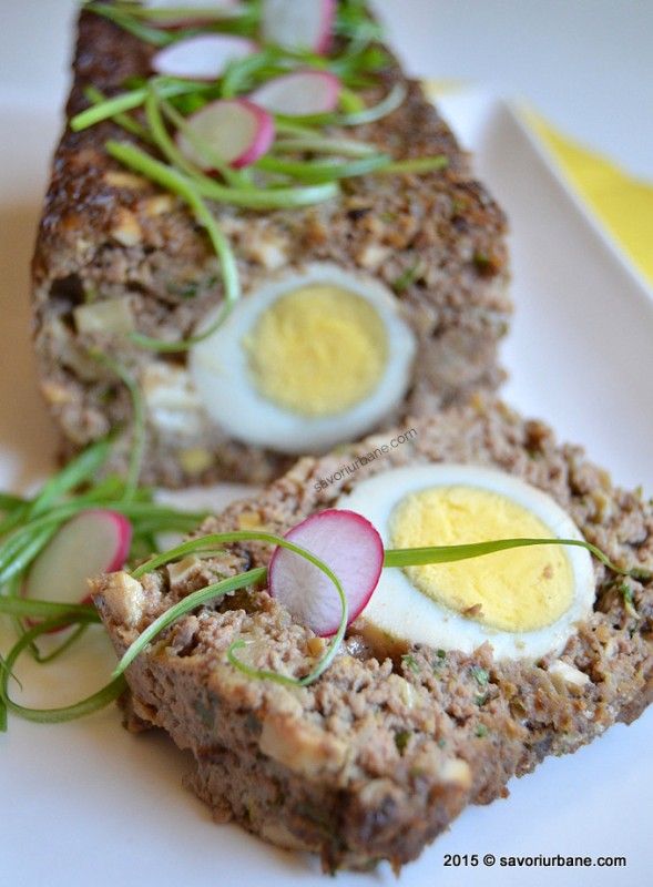 5. Tapetează o tavă de cozonac cu prapurele de miel (sau cu hârtie de copt, dacă nu ai), toarnă jumătate din compoziție, așază ouăle fierte curățate, apoi restul de amestec.