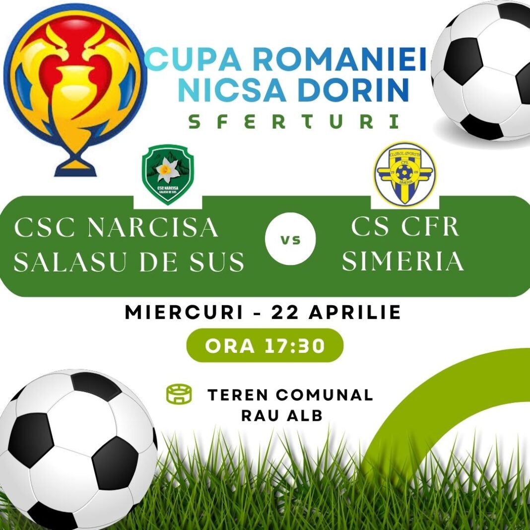 Miercuri, 22 aprilie, iubitorii fotbalului sunt invitați la un nou duel din cadrul Cupei României – Faza județeană „Nicșa Dorin” (sferturi de finală). Pe terenul comunal din Râu Alb, începând cu ora 17:30, se vor întâlni două echipe ambițioase: CSC Narcisa Sălașu de Sus și CS CFR Simeria.
