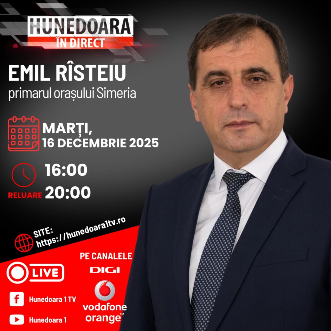 EMIL RÎSTEIU, primarul orașului Simeria la „HUNEDOARA ÎN DIRECT”, ASTĂZI, 16 DECEMBRIE 2025, de la ora 16:00 și în reluare de la ora 20:00, moderator Nicolle EBNER.