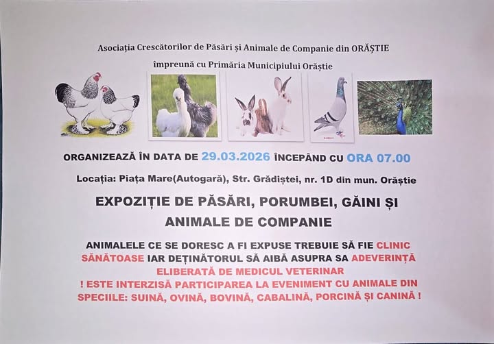 Ivitație lansată de Primăria Orăștie pentru duminică, 29 martie, începând cu ora 7.00, în Piața Mare (str.Grădiștei) la expoziția de păsări, porumbei, găini și animale de companie.