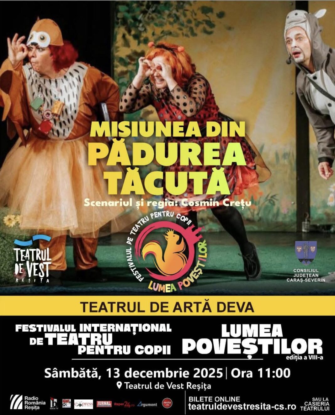 Sâmbătă, 13 decembrie 2025, cei mici și cei mari sunt invitați la o ultimă aventură în cadrul Festivalului „Lumea Poveștilor”: spectacolul „Misiunea din Pădurea Tăcută”, prezentat de Teatrul de Artă Deva.