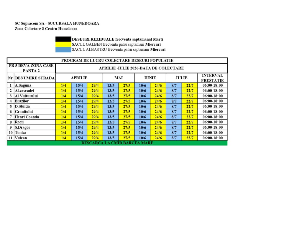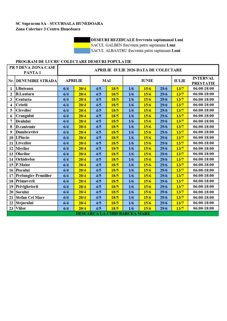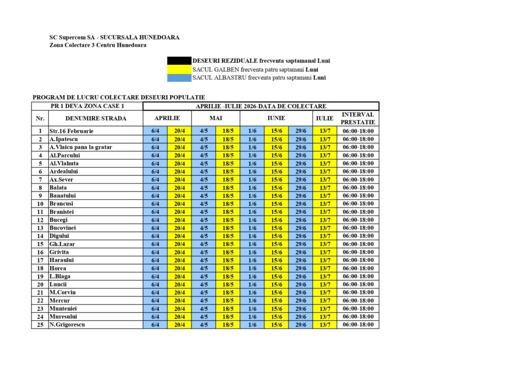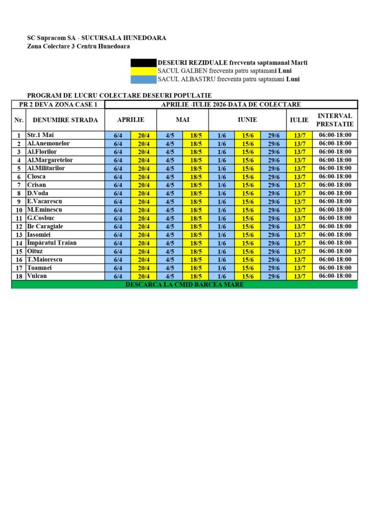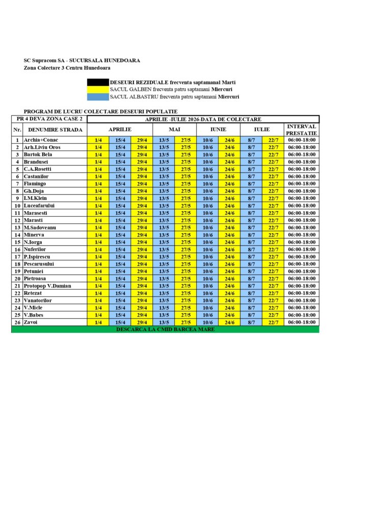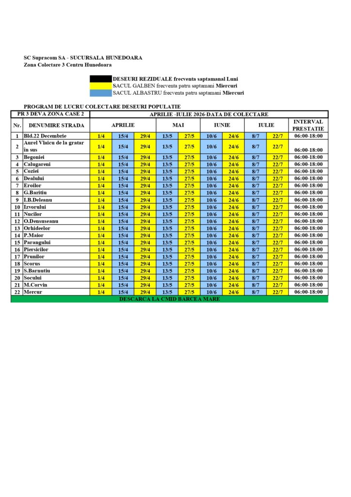 Primăria municipiului Deva anunță graficul de colectare deșeuri pentru perioada aprilie-iulie 2026.