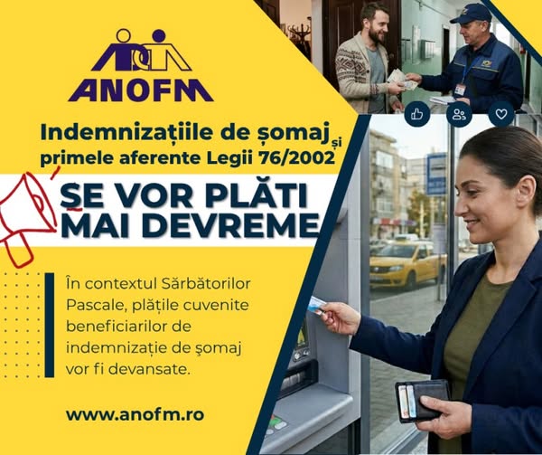 În contextul Sărbătorilor Pascale, ANOFM  anunță devansarea plăților pentru indemnizațiile de șomaj, precum și pentru primele acordate în baza Legii nr. 76/2002.