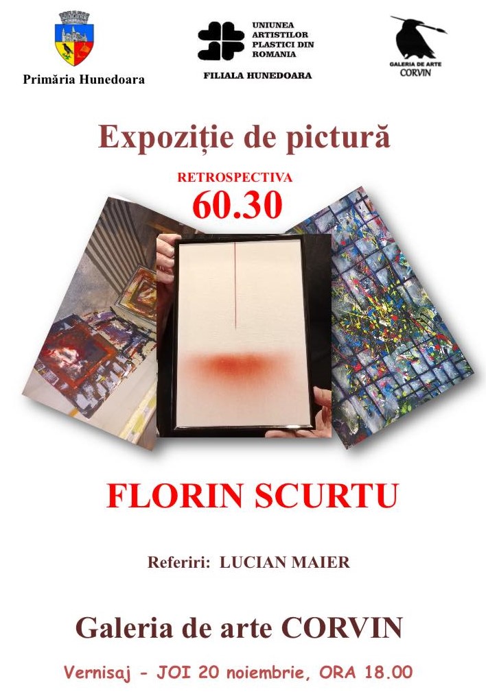 Joi, 20 noiembrie, începând cu ora 18:00, Uniunea Artiștilor Plastici Hunedoara vă invită la Galeria de Arte Corvin pentru vernisajul expoziției retrospective „60.30 – Florin Scurtu”.