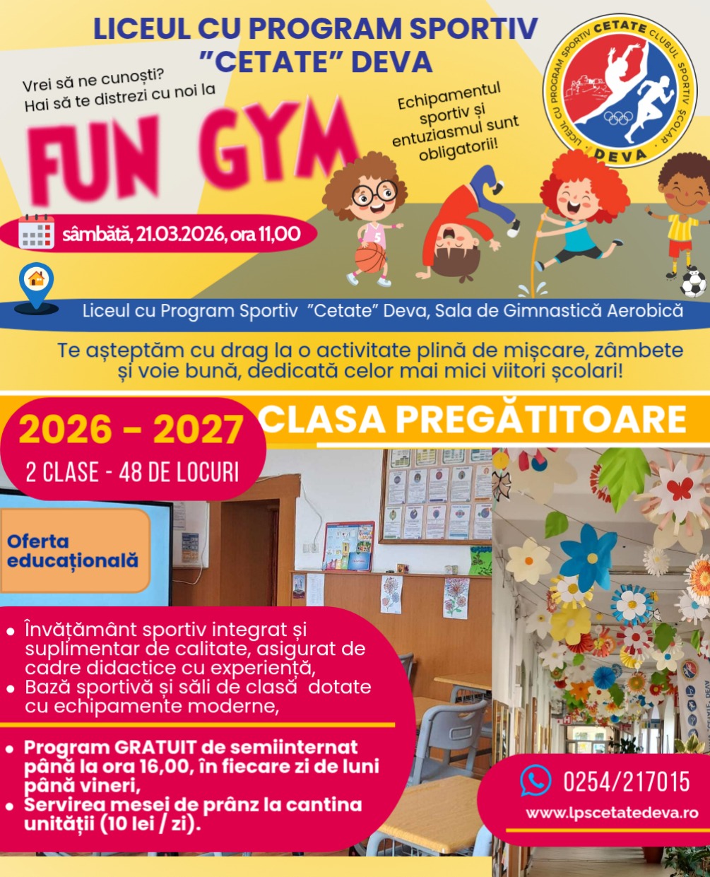 Sâmbătă, 21 martie, ora 11:00, în sala de gimnastică aeroică a Liceului cu Program Sportiv „Cetate Deva” va avea loc o activitate plină de mișcare, zâmbete și voie bună, dedicată celor mai mici viitori școlari!
