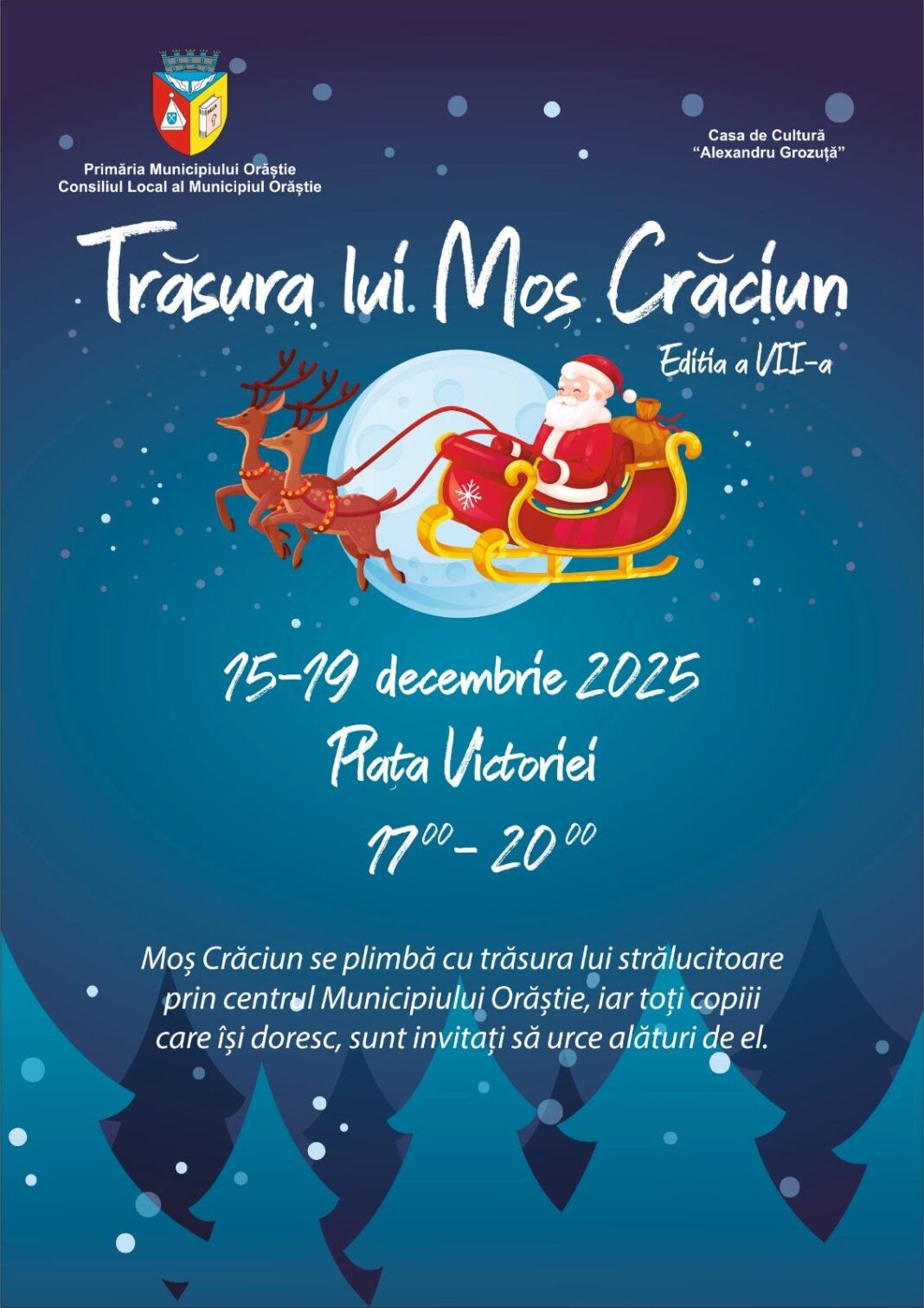 Cei mici sunt invitați să urce în trăsură alături de Moșul cel darnic, pentru o plimbare încărcată de emoție și bucurie. Evenimentul este gândit ca un moment special pentru toți copiii, oferindu-le ocazia de a trăi o experiență de poveste chiar în inima municipiului. Administrația locală anunță și alte activități tematice pe parcursul celor cinci zile, în cadrul unui program festiv menit să aducă spiritul Crăciunului cât mai aproape de comunitatea din Orăștie.