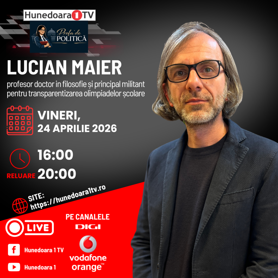 LUCIAN MAIER, profesor doctor in filosofie și principal militant pentru transparentizarea olimpiadelor școlare la „Profa” de POLITICĂ, ASTĂZI, 23 aprilie 2026, de la ora 16:00 și în reluare de la ora 20:00, moderator Ioana Dobreanu.