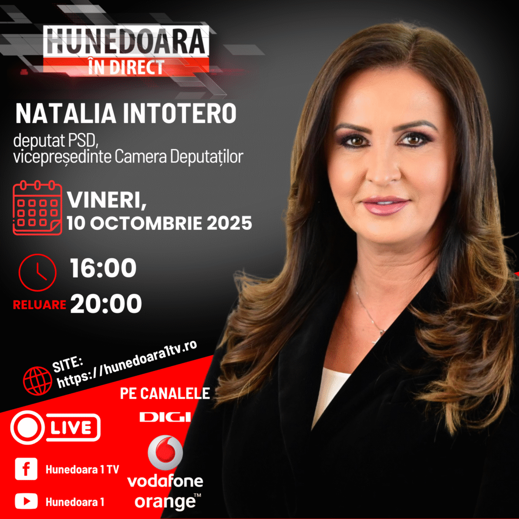 NATALIA INTOTERO, deputat PSD, vicepreședinte Camera Deputaților la „HUNEDOARA ÎN DIRECT”, ASTĂZI, 10 OCTOMBRIE 2025, de la ora 16:00 și în reluare de la ora 20:00, moderator IOANA POP.
