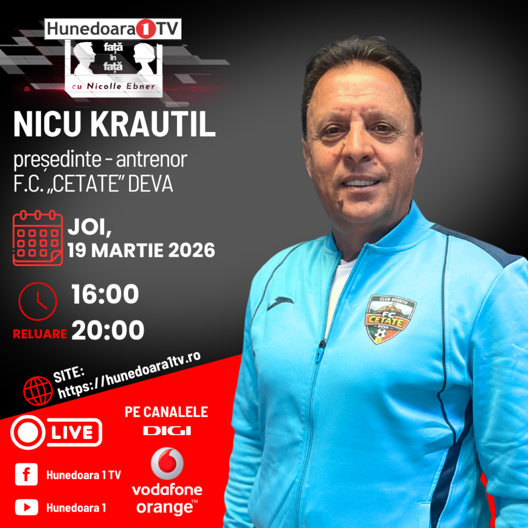 NICU KRAUTIL, președinte-antrenor F.C. „CETATE” DEVA la „FAȚĂ ÎN FAȚĂ”, ASTĂZI, 19 MARTIE 2026, de la ora 16:00 și în reluare de la ora 20:00, moderator NICOLLE EBNER.