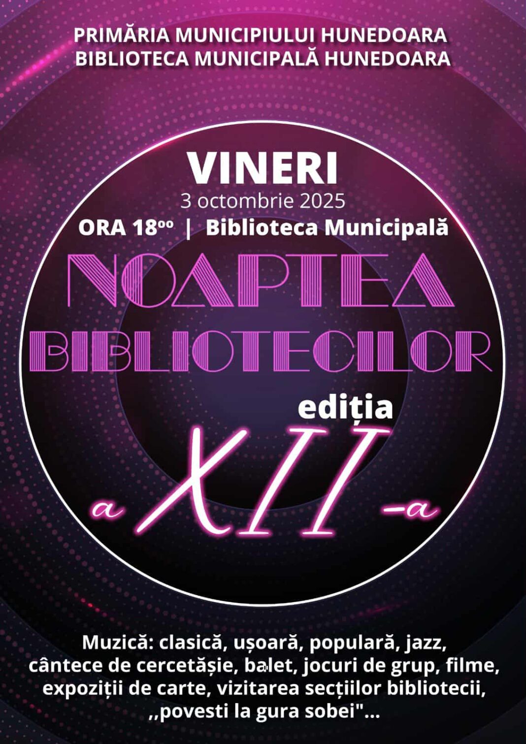 Biblioteca Municipală Hunedoara își deschide porțile vineri seara, pentru toți iubitorii de lectură. Vizitatorii pot citi, pot împrumuta sau restitui cărți și, în plus, se pot bucura de un program artistic și cultural deosebit, pregătit special pentru această ocazie.