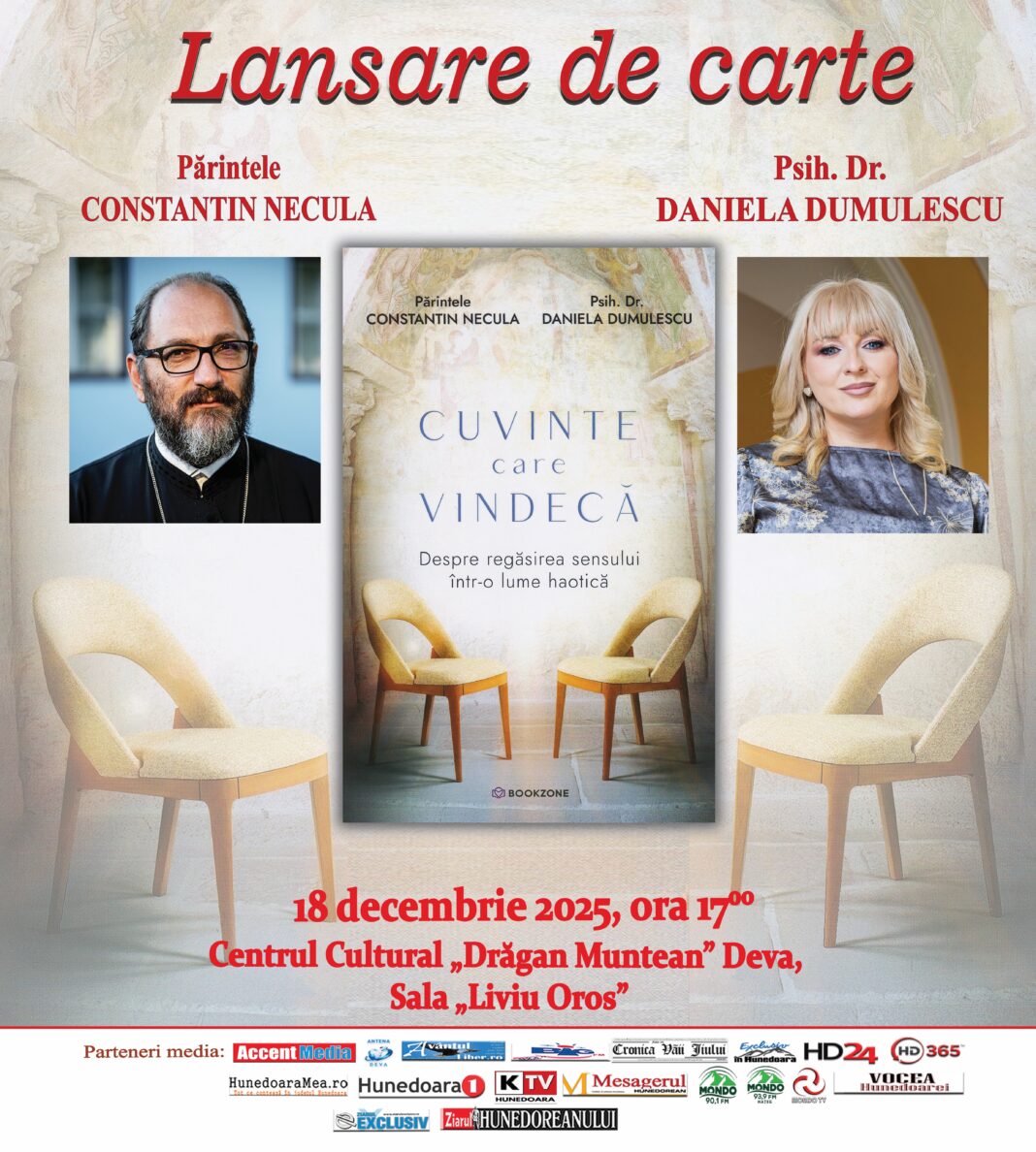 Biblioteca Județeană „Ovid Densusianu” Hunedoara – Deva, cu sprijinul Consiliului Județean Hunedoara organizează în ziua de 18 decembrie 2025, ora 1700, în Sala „Liviu Oros” a Centrului Cultural „Drăgan Muntean” din Deva, un eveniment cultural-spiritual cu totul special: lansarea volumului „Cuvinte care vindecă. Despre regăsirea sensului într-o lume haotică”, apărut la Editura Bookzone în anul 2025, ai cărui autori sunt părintele Constantin Necula și doamna psiholog dr. Daniela Dumulescu.