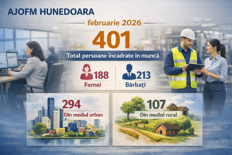 În luna februarie 2026, prin intermediul serviciilor oferite de 𝐀𝐉𝐎𝐅𝐌 𝐇𝐮𝐧𝐞𝐝𝐨𝐚𝐫𝐚, au fost încadrate în muncă 𝟒𝟎𝟏 𝐩𝐞𝐫𝐬𝐨𝐚𝐧𝐞. Din totalul persoanelor ocupate: