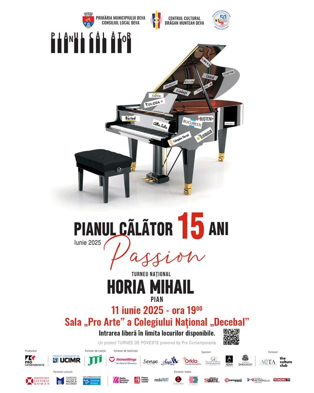 Primăria Municipiului Deva și Centrul Cultural ,,Drăgan Muntean” organizează miercuri, 11 iunie 2025, la ora 19:00, în sala ,,Pro Arte” a Colegiului Național ,,Decebal” din Deva, un spectacol extraordinar intitulat „Passion”, susținut de artistul Horia Mihail, celebrând astfel 15 ediții ale „Pianului Călător” și totodată 15 ani de pasiune pentru muzică și comunitate.