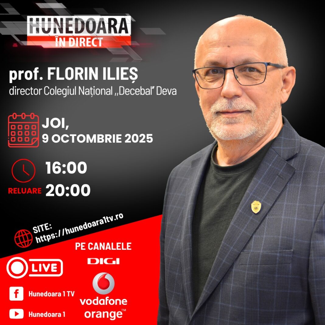 prof. FLORIN ILIEȘ, director Colegiul Național ,,Decebal’’ Deva la „HUNEDOARA ÎN DIRECT”, ASTĂZI, 9 OCTOMBRIE 2025, de la ora 16:00 și în reluare de la ora 20:00, moderator IOANA POP.