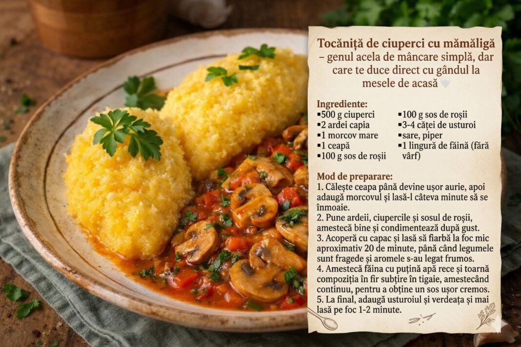 Astăzi vă propunem o rețetă de tocăniță de ciuperci cu mămăliguță caldă – genul acela de mâncare care te duce direct cu gândul la mesele de acasă, la copilărie și la confortul unei mese calde în familie.