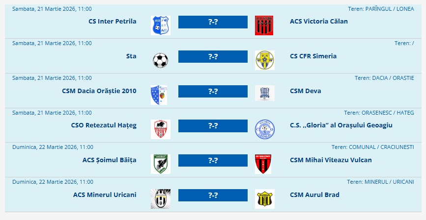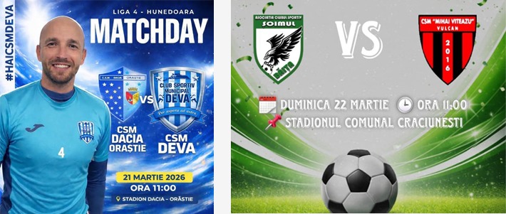 În cadrul etapei a XVII-a Ligii a IV-a de fotbal organizată de AJF Hunedoara, în acest weekend se vor disputa următoarele partide: