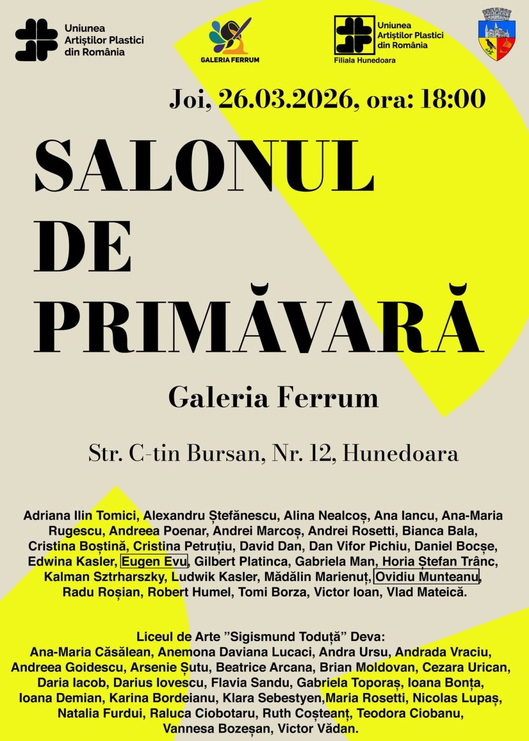 Uniunea Artiștilor Plastici din România – Filiala Hunedoara vă invită 𝐣𝐨𝐢, 𝟐𝟔 𝐦𝐚𝐫𝐭𝐢𝐞 𝟐𝟎𝟐𝟔, 𝐝𝐞 𝐥𝐚 𝐨𝐫𝐚 𝟏𝟖:𝟎𝟎, la vernisajul unei expoziții de excepție, găzduită de Ferrum Art Gallery. Veți descoperi lucrări semnate de artiști consacrați, dar și de tineri talentați de la Liceul de Arte „Sigismund Toduță” Deva – o întâlnire autentică între experiență și noua generație de creatori.