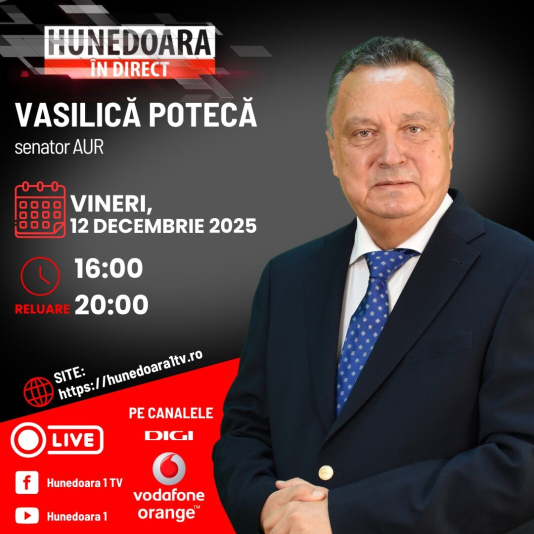 VASILICĂ POTECĂ, senator AUR la „HUNEDOARA ÎN DIRECT”, ASTĂZI, 12 DECEMBRIE 2025, de la ora 16:00 și în reluare de la ora 20:00, moderator Nicolle EBNER