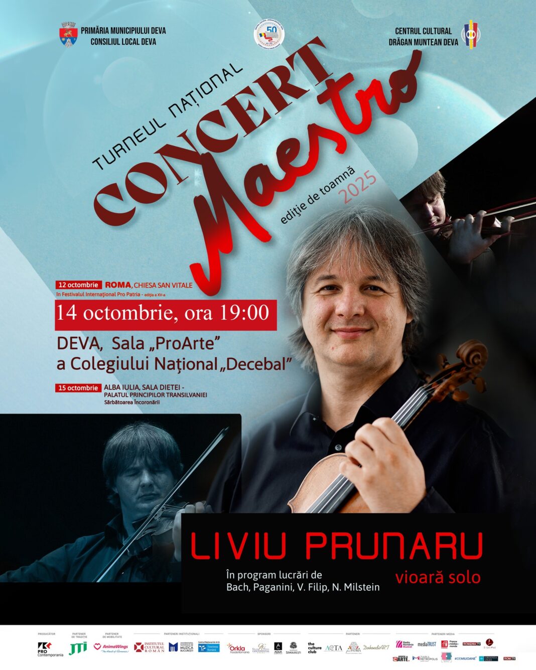 Primăria Municipiului Deva și Centrul Cultural „Drăgan Muntean” organizează marți, 14 octombrie 2025, de la ora 19:00, la Sala Pro Arte a Colegiului Național „Decebal” din Deva, un recital extraordinar susținut de maestrul Liviu Prunaru, în cadrul ediției de toamnă a Turneului Național „Concertmaestro”.