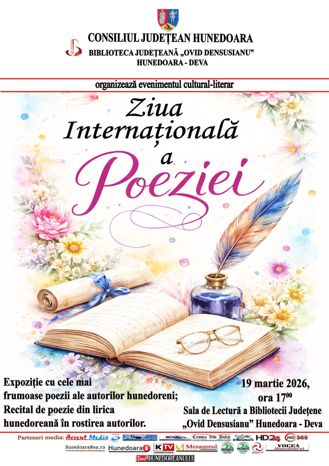 Biblioteca Județeană „Ovid Densusianu” Hunedoara – Deva, cu sprijinul Consiliului Județean Hunedoara, organizează în ziua de 19 martie 2026, ora 1700, la Sala de Lectură, un eveniment cultural dedicat Zilei Internaționale a Poeziei. În anul 1999, Organizația Națiunilor Unite pentru Educație, Știință și Cultură (UNESCO) a hotărât desemnarea zilei de 21 martie ca Zi Internațională a Poeziei.