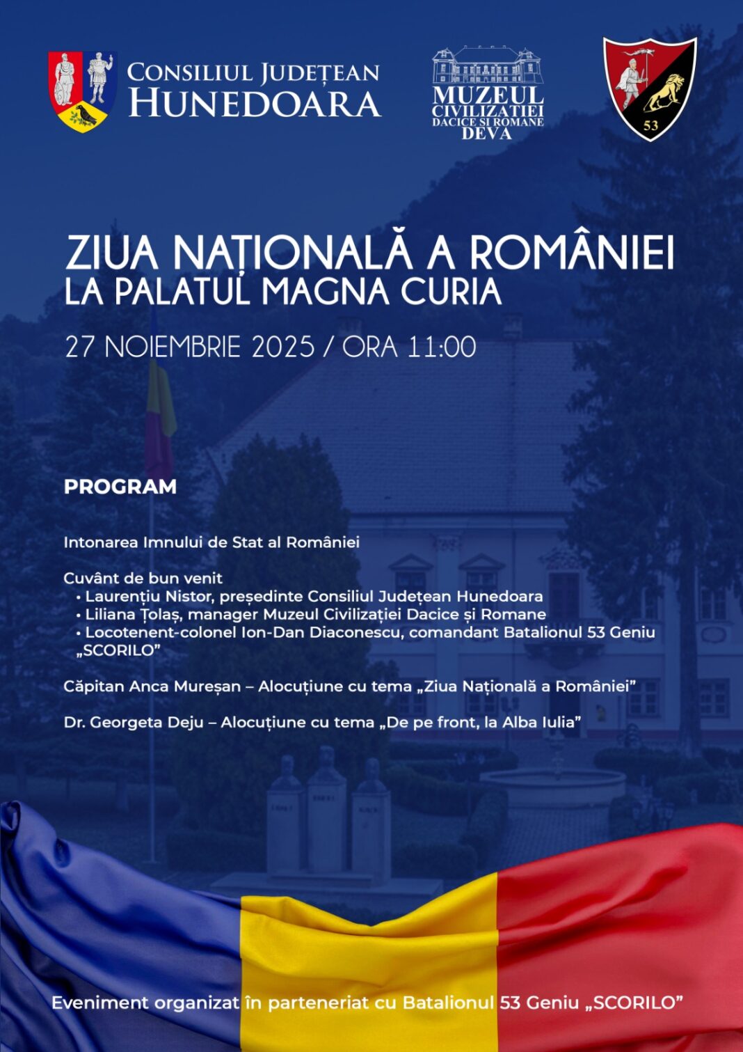 Eveniment organizat de Consiliul Județean Hunedoara, prin Muzeul Civilizației Dacice și Romane Deva, în parteneriat cu Batalionul 53 Geniu „SCORILO”, cu prilejul Zilei Naționale a României. Evenimentul va avea loc joi, 27 noiembrie 2025, de la ora 11:00, la Palatul Magna Curia din Deva, și va include momente oficiale și alocuțiuni susținute de reprezentanți ai instituțiilor județene și ai Batalionul 53 Geniu „SCORILO”.