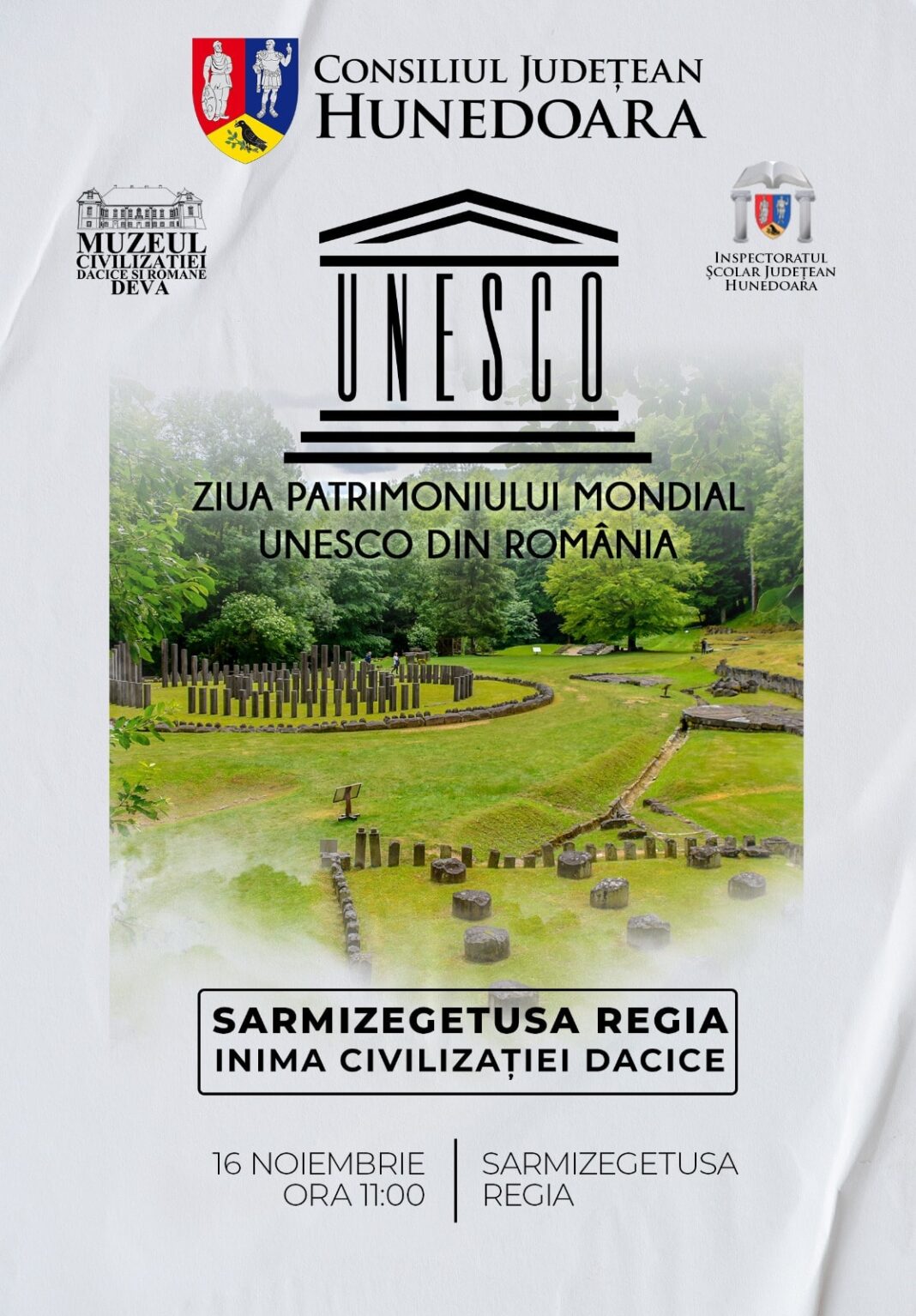 Ziua Patrimoniului Mondial UNESCO din România va fi marcată de Muzeul Civilizației Dacice și Romane (MCDR) Deva, duminică, 16 noiembrie, la cetatea dacică Sarmizegetusa Regia, din Munții Orăștiei, prilej cu care în perimetrul sitului vor avea loc întâlniri cu specialiști în patrimoniu, care vor readuce în prim-plan moștenirea dacilor. Cu această ocazie, de la ora 11:00, în perimetrul sitului dacic vor fi organizate activități educative, momente culturale și întâlniri cu specialiști ai muzeului devean.